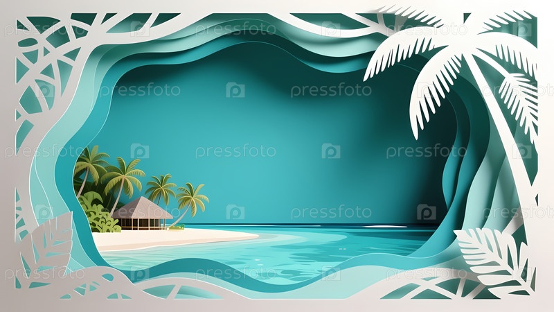 Красочный вид пляжа, показывающий море, мягкие волны, хижину недалеко от берега и пальмы на заднем плане.Эта открытка фиксирует солнечный день на побережье Generative AI