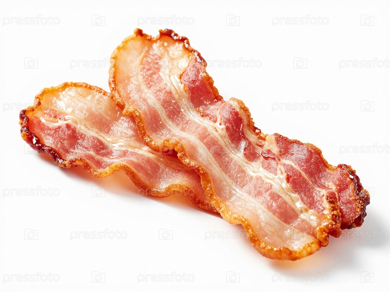 Два куска приготовленного бекона лежат бок о бок на белой поверхности и готовы к употреблению с другими блюдами или в качестве закуски в любое время