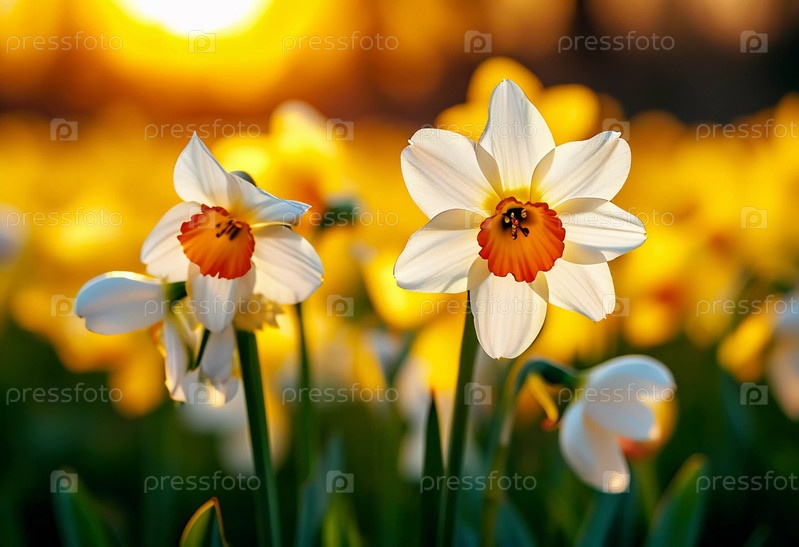 Цветы нарцисса растут в клумбе, а солнечный свет светит на заднем плане.Сцена показывает цветение цветов в саду при закате Солнца Generative AI