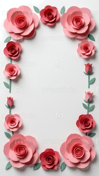 Красные и розовые бумажные розы обрамляют пустое пространство, создавая декоративную открытку.Дизайн прост и элегантен, подходит для различных случаев Generative AI