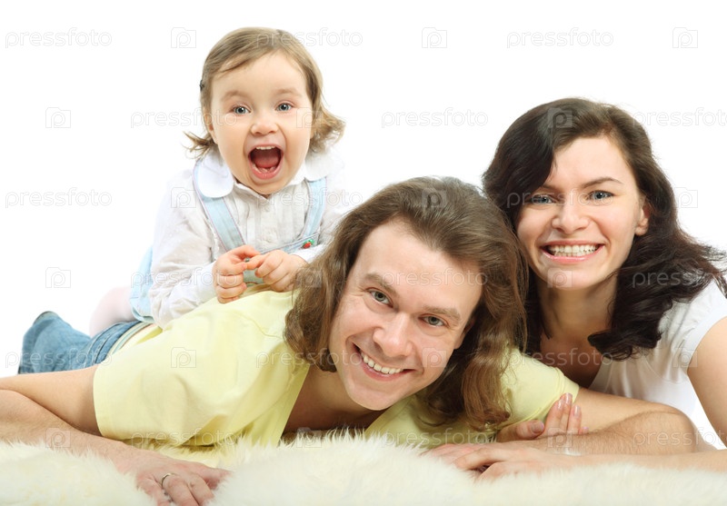 Счастливая молодая семья - мать и отец лежат на белом пушистом мехе и