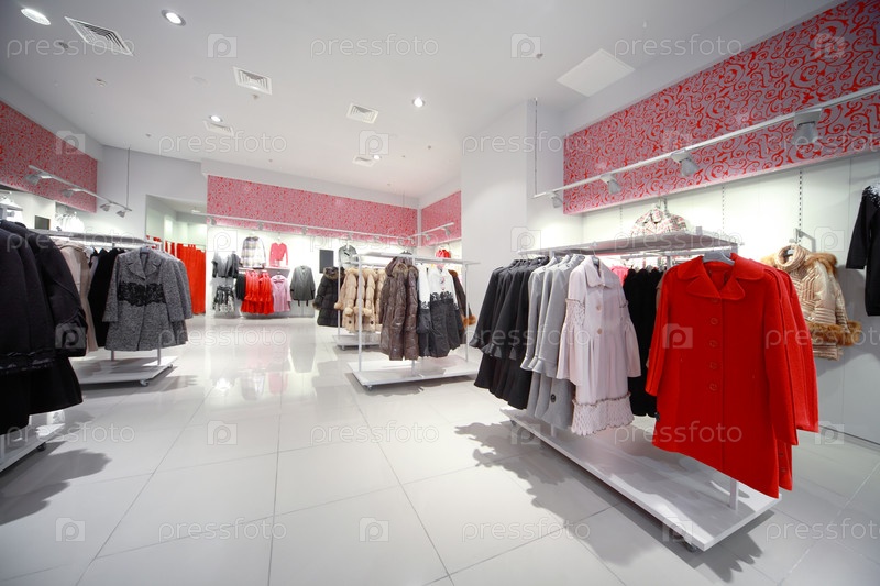 Внутри магазина серо-красный зал с висящей верхней одеждой - пальто и