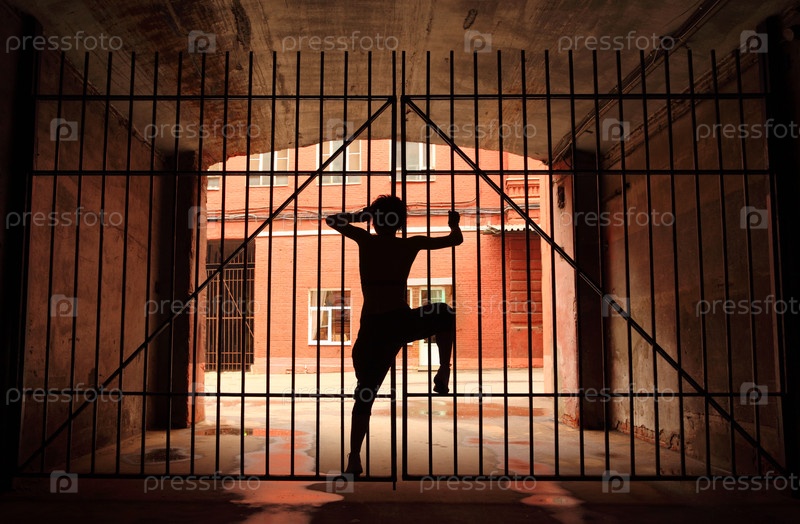 Силуэт танцующей девушки в темноте, она взбирается на решетку с
