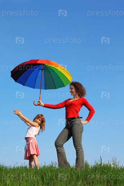 Мать стоит на поле с зеленой травой против голубого неба и держит