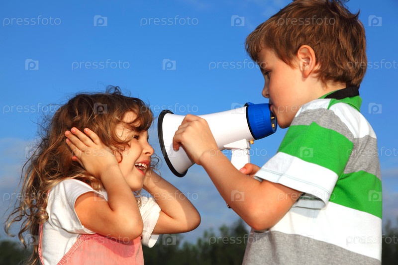 Маленький мальчик и девочка играют с громкоговорителем, на фоне синего
