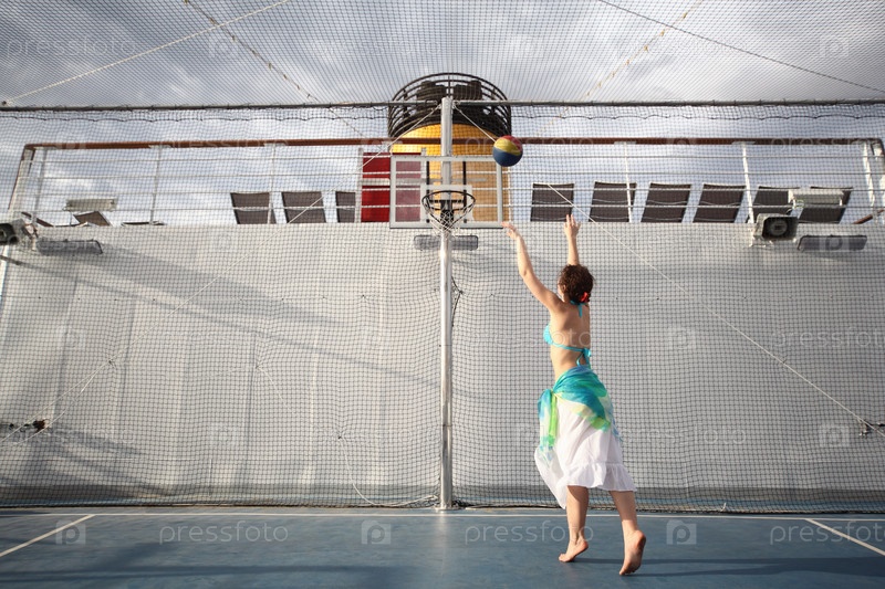 Женщина прыгает, чтобы ударить волейбол на корте круизного лайнера