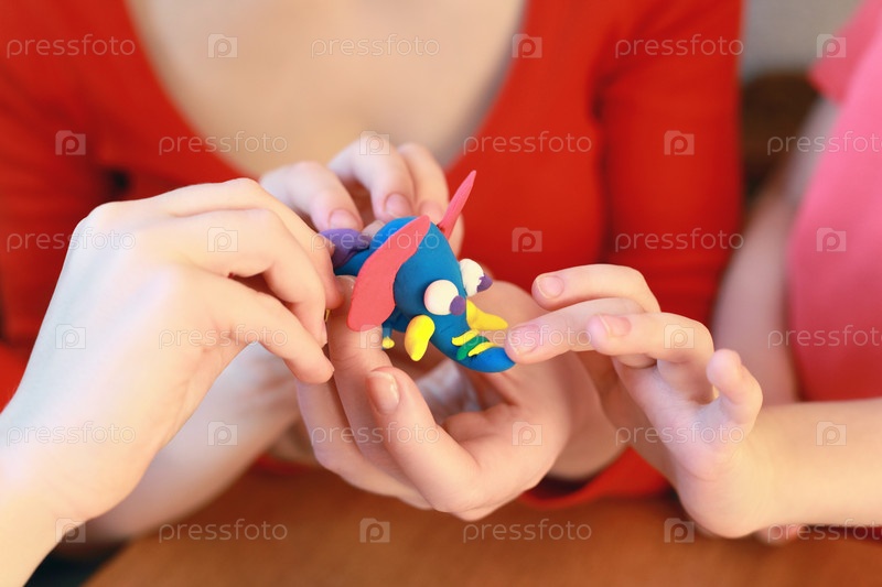 Две руки формируют красочную глиняную рыбу