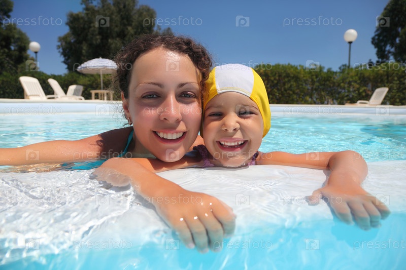 Солнечный бассейн с улыбающейся матерью и ребенком