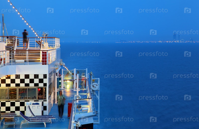 Освещенный круизный корабль с людьми на палубе в море ночью возле