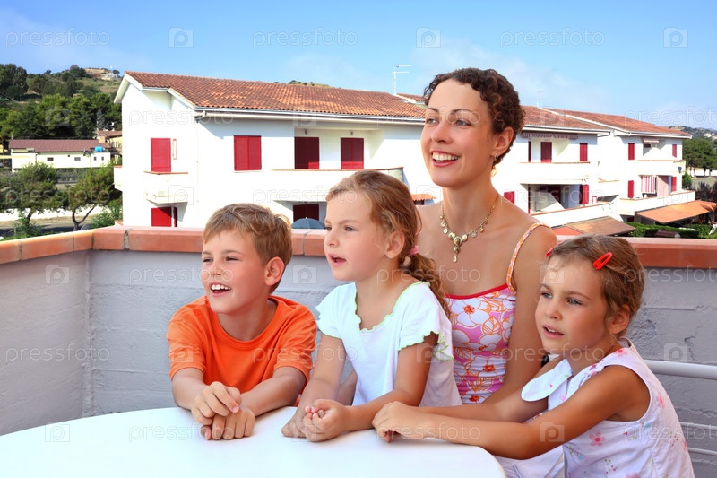 Мать с тремя детьми сидят днем на балконе возле стола и