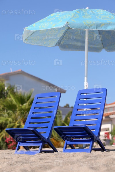 Два пустых пластиковых стула стоят бок о бок на песке днем под