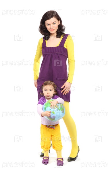 Молодая мать в желто-фиолетовой одежде с маленькой дочерью, которая держит