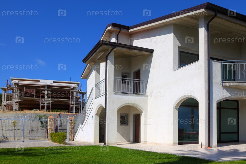 Новый законченный белый двухэтажный дом с садом, балконом и лестницей к