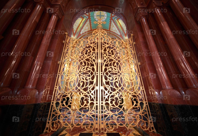 Обработанные позолоченные двери внутри собора Христа Спасителя в Москве,