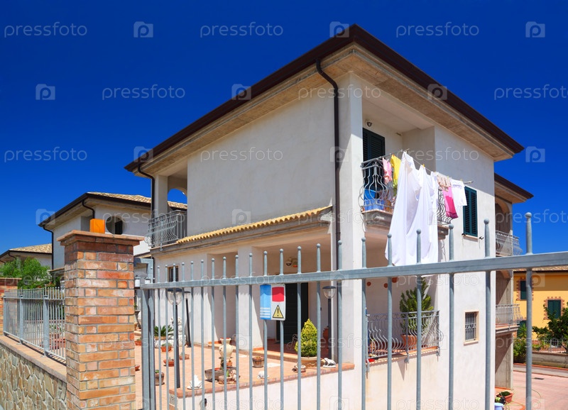 Ограждение белого двухэтажного коттеджа с садом и балконом со свисанием