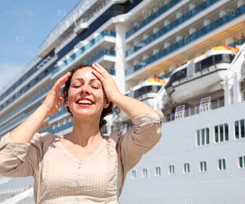 Улыбающаяся девушка с закрытыми глазами стоит возле корабля и гладит волосы рядом