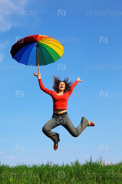 Девушка прыгает по зеленой траве с красочным зонтиком в руке против