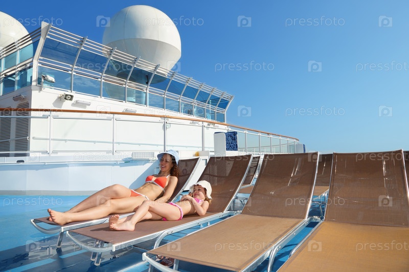 Две женщины отдыхают на шезлонгах у бассейна круизного лайнера