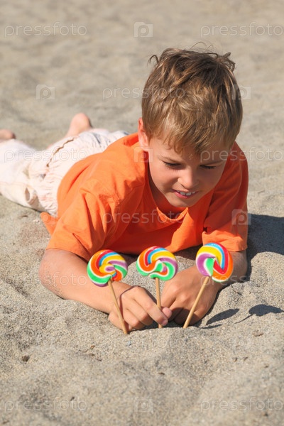 Кавказский мальчик в оранжевой рубашке, лежащий на пляже с многоцветными лакомствами