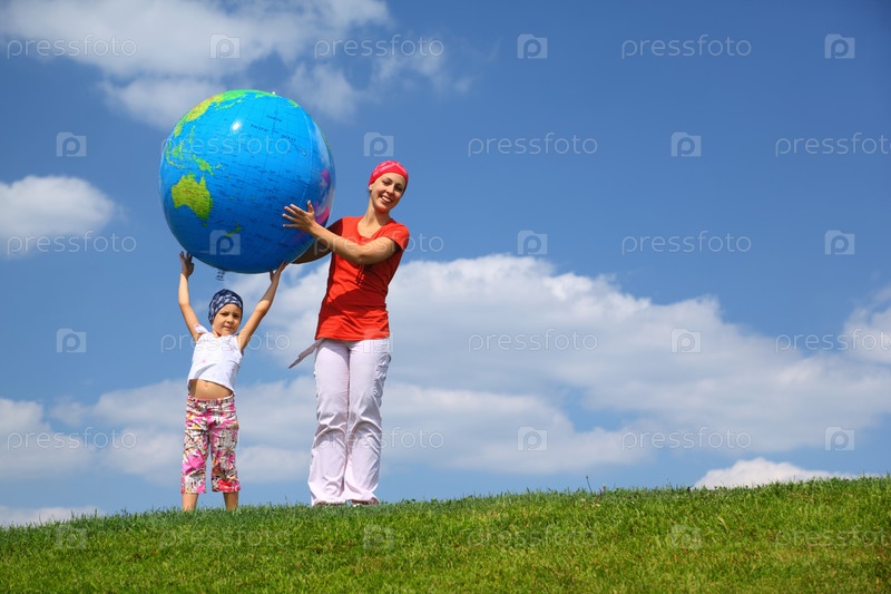 Девочка поднимает надувный шар вверх, а мать помогает дочери