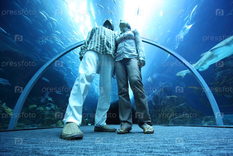 Мужчина и женщина стоят в туннеле подводного аквариума и смотрят вверх, мужчина