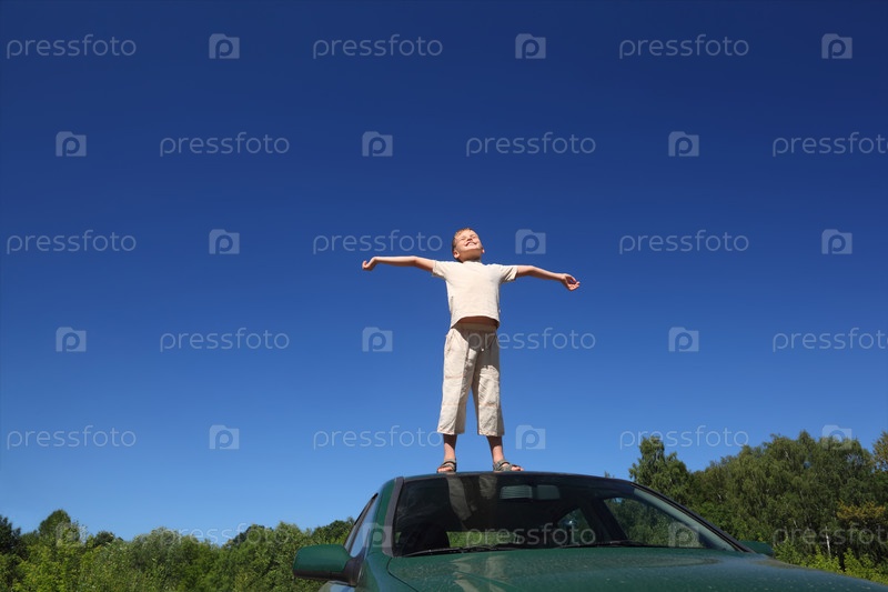 Мальчик стоит на голове автомобиля, поднимает лицо в небо и посылает руки внутрь