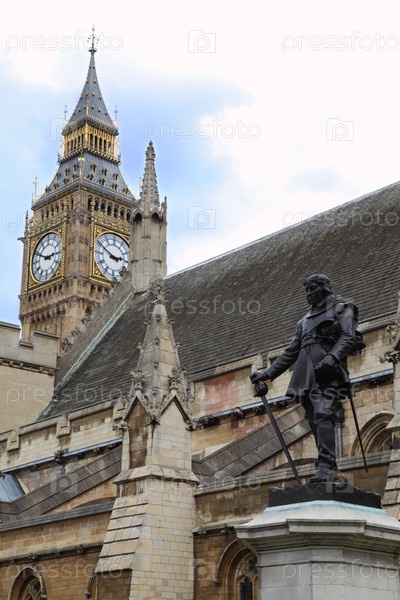 Статуя Оливера Кромвеля в Вестминстере и Башня часа Биг-Бен в