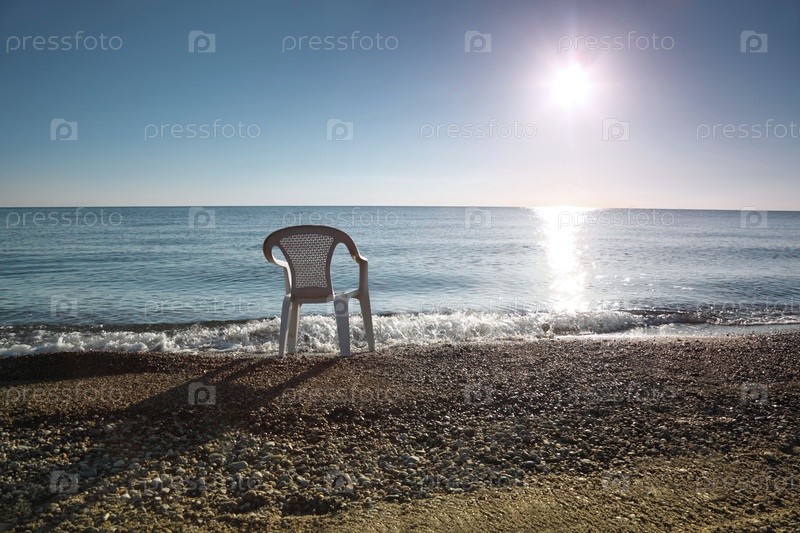 Одинокий белый пластиковый стул сидит на песчаном пляже