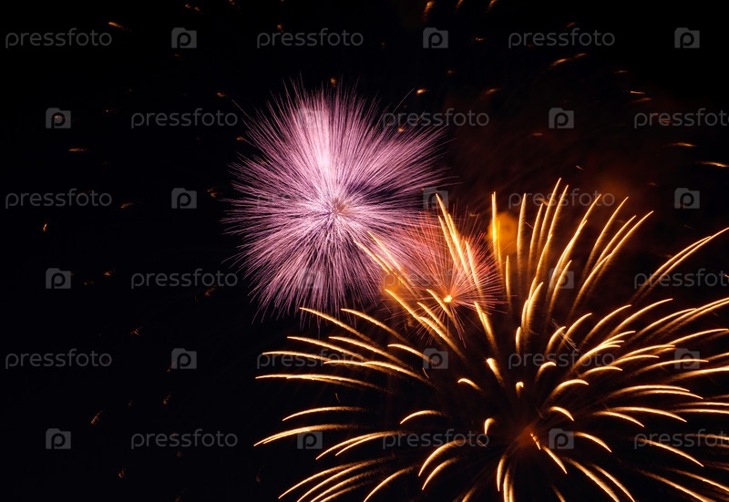 Живые фейерверки взорвались фиолетовыми и золотыми оттенками на темном небе