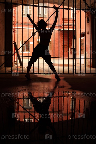 Силуэт танцующей девушки в темноте, которую она держала за решеткой