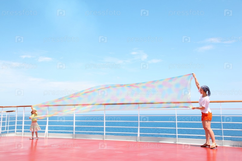 Два человека создают большие, красочные пузыри на палубе круизного лайнера