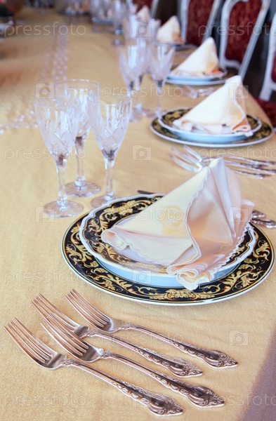 Три чаши, четыре вилки и две тарелки с поддоном на ужине