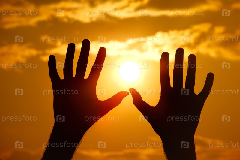 Две руки составляют рамку заходящего солнца на золотых облаках