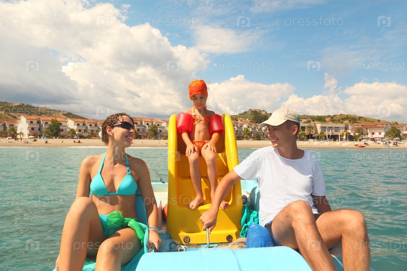 Семья с девочкой на педальной лодке с желтой горки в море, выстрел со стороны