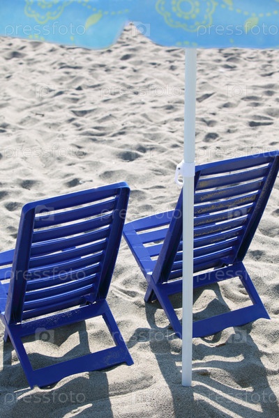 Голубые пляжные стулья сидят на песке возле зонтика