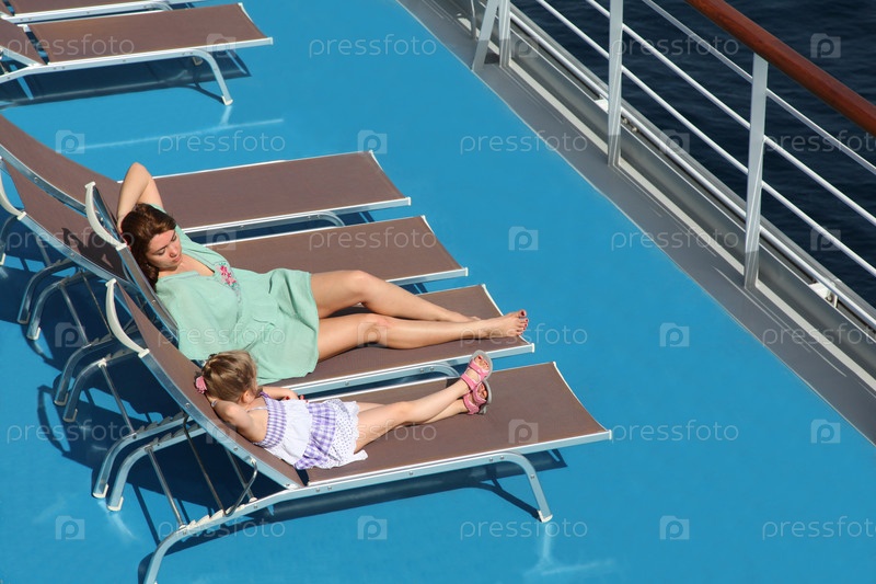 Мать и ребенок отдыхают в креслах на борту круизного лайнера
