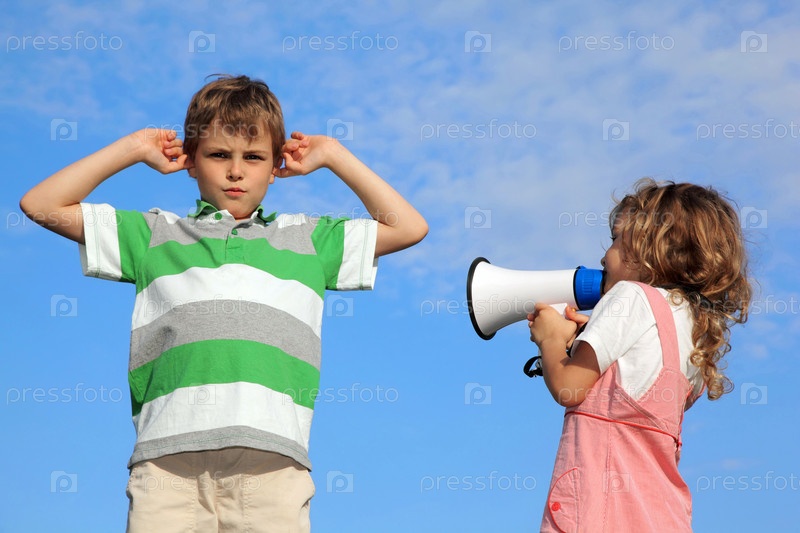 Дети играют на природе, девочка кричит в громкоговоритель, у мальчика есть часовня