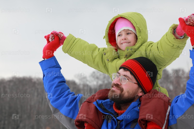 Отец держит ребенка над головой в зимнем парке