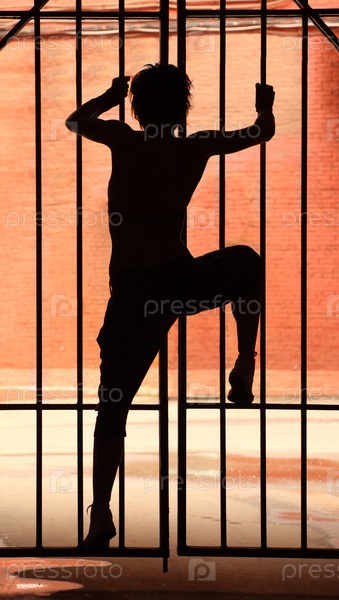 Силуэт танцующей девушки в темноте, она взбирается на решетку с