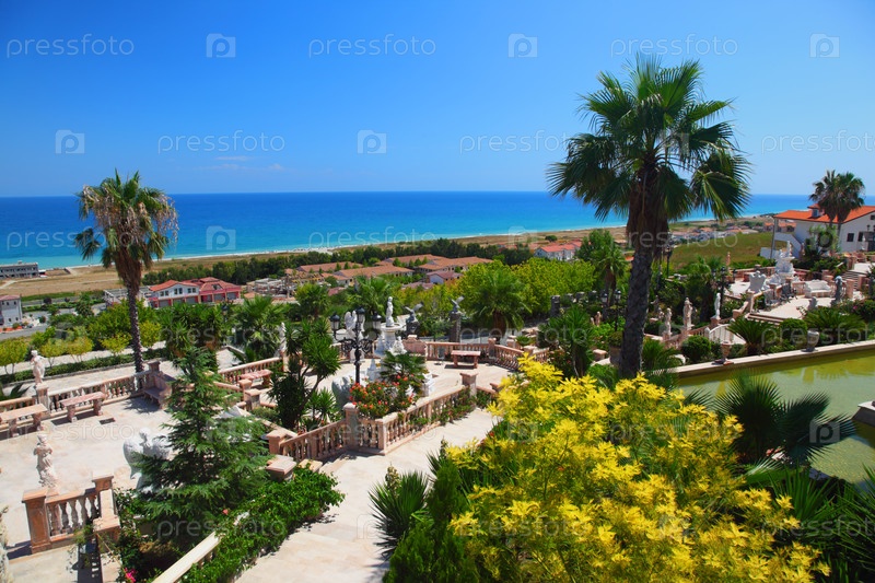 Ботанический сад со скульптурами, скамейками и пальмами на балконе возле