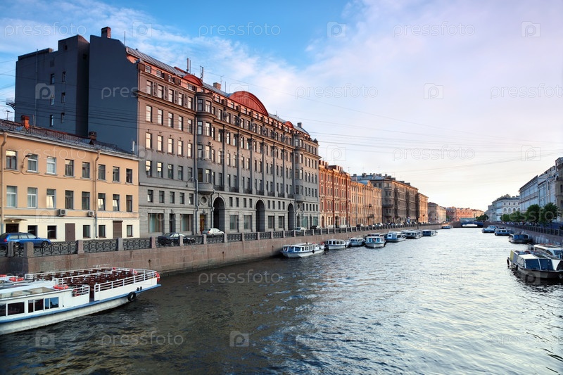 Вид на Санкт-Петербург.Речной канал с лодками в Петербурге