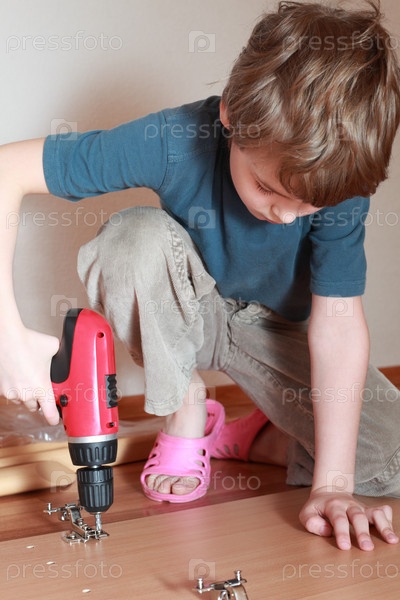 Маленький мальчик сел на колени на пол и усердно затягивал