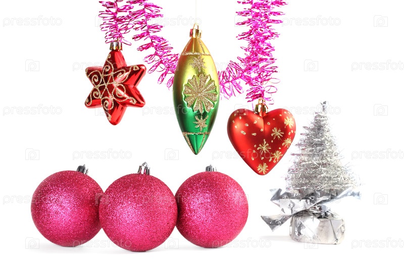 Различные красочные украшения на рождественской елке и тинзель изолированы на