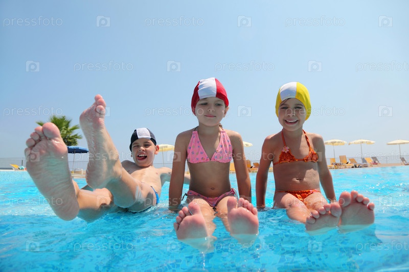 Две девушки сидят на юртах в бассейне и ногах над водой, а мальчик поднимает