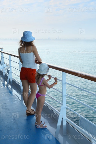 Женщина и ее дочь стоят на палубе круизного лайнера и смотрят