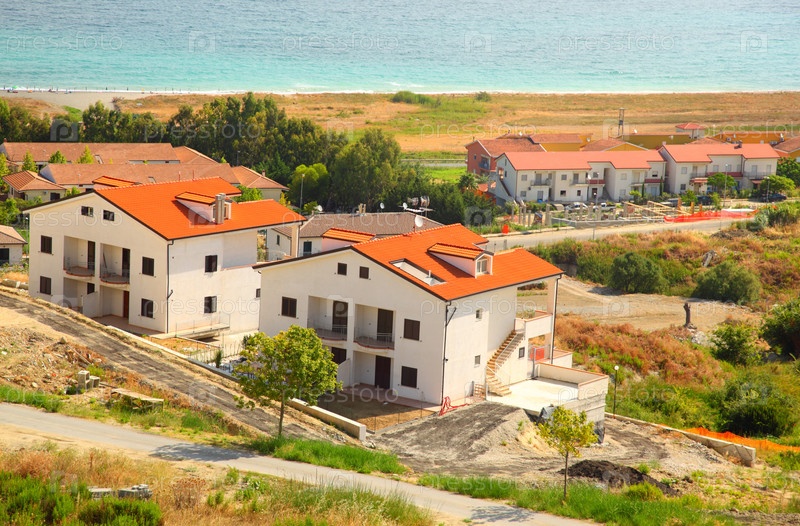 Солнечная прибрежная деревня с терракотовыми зданиями