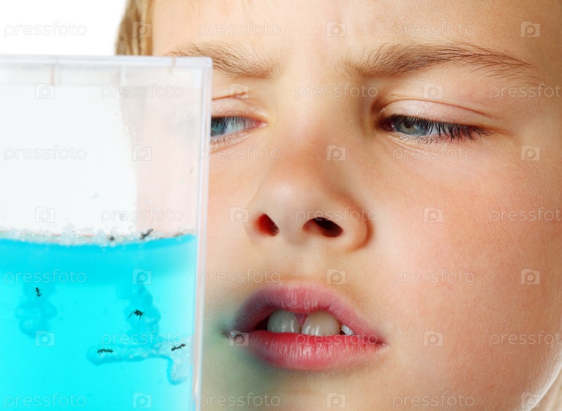 Маленький мальчик внимательно изучает аквариум с гелием - ферму муравьев на белом
