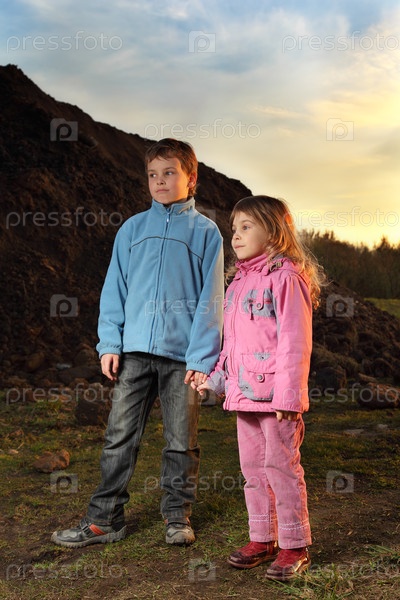 Маленькая девочка в розовой одежде и мальчик в синей куртке стоят возле холма