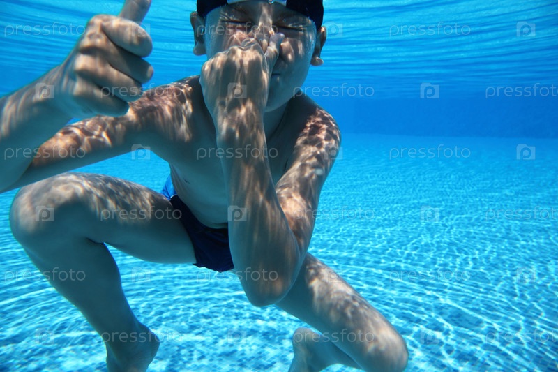 Мальчик ныряет под воду в бассейне, закрывает нос рукой и показывает руку