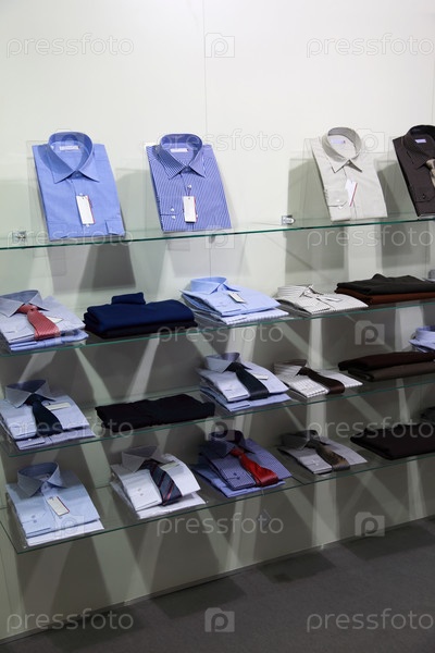 Аккуратно устроенные рубашки выставлены на стеклянных полках